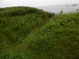 | 99城目 日本最東端、納沙布岬に程近いヲンネモトチャシを訪問。遠く奥深い場所に存在する日本100名城最難関(だと思う)の地。100名城スタンプラリー99城目。ここはスタンプラリーがなかったら来なかっただろうなあ、、、何もないと言えば何もないが、ほったらかしの荒涼感が逆に果ての地まで来た事を思い知らせてくれる。根室駅目の前の観光センターで100名城制覇のステッカーをいただく。 チャシとはアイヌ語で砦や囲いの意味で、見張場、祭事、集会等多目的に使われたそう。根室半島一帯にわたり、32ヶ所のチャシ跡が存在しているが、保存状態が良好で、他地域より分布密度が濃いとの事。オンネモトチャシは、岬や丘を堀で区画した面崖式。 |