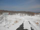 | 【34城目】 釧路出張。休暇を利用し根室本線で約2時間半揺られて根室駅に到着。近くの名店どりあんでエスカロップを食し、いよいよチャシ跡群へ。最初の「ノツカマフ1・2号チャシ跡」ではチャシ跡で写真でも撮ろうと雪が膝まである中、半ば強引にチャシ目指して歩き出したが、5mほど歩いたところで、「そこまでして行く必要があるのか?」とふと我に返り引返す。靴の中まで雪で濡れかなり後悔。次の「ヲンネモトチャシ跡」も雪は残っていたが、踝のあたりまで。さすがにチャシ跡近辺は人の足跡はなく、歩きにくい中何とか到着。好天に恵まれたが、風が吹くと「かなり」寒い。出張ついでなので仕方がないが、やはりこの時期に来る場所ではない…その後納沙布岬まで行き、オーロラタワー、北方館、北方領土館、灯台などを回り、最後に歴史と自然の資料館(剥製がよかった)へ。スタンプはここと根室駅のインフォメーション観光センターの両方にあるのだが資料館の方が新しい(質は両方OK)。最後に観光センター横の売店で100名城チャシ跡群ストラップ(500円)を購入。関連グッズが揃っているのは初めてで面白かった。 |