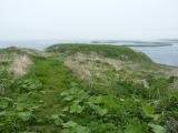 | 83城目 次男が友達と登城。 釧路空港からスタンプがある根室市歴史と自然の資料館までレンタカーで2時間10分程。 あいにくの天気だったため、納沙布岬で写真を撮り、チャシには足を運ばなかったとのことで、後日妻と登城予定。 2019年6月25日 妻と2人で登城 前日釧路に宿泊。途中、厚岸漁業協同組合の直売店エーウロコに立ち寄り花咲ガニと弁天牡蠣、鉄砲汁などを購入。12時過ぎにレンタカーで根室に到着、ニューモンブランにてエスカロップの昼食を取る。その後、根室市観光インフォメーションセンターに立ち寄る。根室市内は晴れていたが、納沙布岬に向かうに連れて霧が発生。納沙布岬では霧で視界不良。納沙布岬から5分ほどで、ヲンネモトチャシ跡駐車スペースに到着。こちらは納沙布岬ほどの霧の濃さではなかった。駐車スペースから200mほどでヲンネモトチャシ跡の先端に到着。途中、切岸の名残がここがかってアイヌの砦であったことを彷彿させてくれる。 |