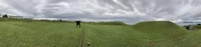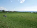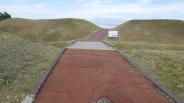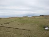 5時起床でホテルを出発。雨上がりで路面が濡れている中、15分程度で到着。車を停める場所がなく困ったが、入り口を少し入った急坂に頭から突っ込んで、足早にまわる。急坂過ぎるのと砂利道のため、FR車では登れなさそうであった。いざ場内に入ると青々とした芝が夜明けの明るさできれいに映え、海と空港の間に位置する空間の広がりを感じることができた。整備されているにもかかわらず、訪れる人が少ないだろうからか、きれいな状態であった。スタンプを押して車に戻ると来訪者がおり、駐車した車両がお邪魔虫となっていたので、すみやかに退出。 |