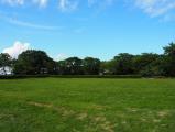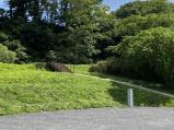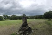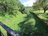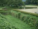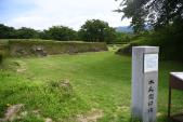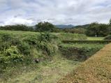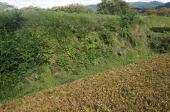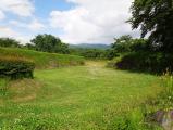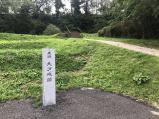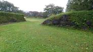 | 埋蔵文化センターでスタンプを押印。ガイドハウスの駐車場に車を停め、本丸を目指し、雨で濡れた草の茂った緩い登り道を歩く。本丸・二の丸・三の丸はきれいに草が刈られ整備が行き届いていた。 |