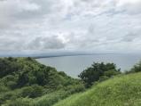 | 前日、秋田城の案内所の方から狭い道を上ると小さな駐車場がありますと聞いていたのですが、本当に狭い。上るのも下るのも対向車が来たら覚悟が必要です。 駐車場から城址まではゆっくり歩いても10分ほど。上まで登ると眼下にきれいな海岸線とそこに並び立つ風力発電の風車が見えます。 古い城跡と先端技術の風車。ちょっと面白い! |