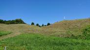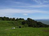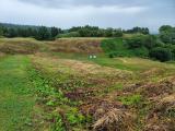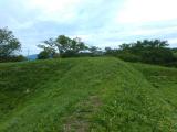 | 早朝から登城。案内所までクルマで上がるが、菅原神社を過ぎたあたりで道に大きく穴が出来てるので要注意! 雨も上がって、青空に草の緑が映えて、海の眺めもあって、素晴らしい遺構だと実感した。 ただし、大雨で地面に水が浮いていて、ところどころぬかるむところもあった。その分、井戸がわかりやすかったが。 |