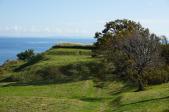 日本海に突き出した男鹿半島の付け根に東北最大級の山城が広がる。 城の歴史よりも、先ずは、眼下に広がる 日本海の絶景を楽しむのも一つだが、 内館の大土塁、広大な城域に連続する曲輪の周囲を 流れるように走る土塁のラインに期待したが、 繁茂する雑草に覆われ、確認できなかったのが悔やまれる。 |