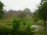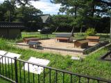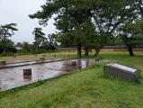 | 久保田城を出発し、車で20分程度で、秋田城跡資料館に到着。あの和同開珎が出土するなど過去の繁栄が偲ばれる。スタンプ押印後、雨が降り出したので、傘をお借りし、城跡へ。政庁跡を通り、10分ほどで東門に到着。古代水洗トイレの遺構も残り、見学を楽しめた。 |