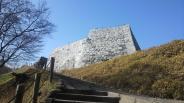 | 宿泊した裏磐梯高原から二本松城へ。 想像以上に石垣が立派で,また紅葉も非常に美しく,天守台からの眺めは最高でした。 天守台脇には,戊辰戦争で敗れた際に自刃した丹羽和左衛門・安部井又之丞の自刃の碑があります。最期の遂げかた,凄まじいものがあります。 |