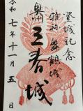 | 続100名城8城目(100名城86城,通算94城)本日1城目。先週に引き続き、妻が城巡りに同行したいということで、7:45に新潟を出発。磐越道を160km走り9:45に三春町歴史民俗資料館に到着。スタッフの方には申し訳なかったが館内には入らず、スタンプだけをゲット。 駐車場から本丸まではあっという間で10:00登城。見晴らしもよく、ハイキングの親子連れ以外はだれもいなかった。ただ24時間スタンプを押せるよう、本丸付近の鶏小屋みたいなスタンプ台はすごくいいと思った。ああいうサービス精神は大好き。隣県・福島県制覇。快晴の中10:10に米沢城に向かう。途中吾妻SAでこんにゃくを食べたがなかなか旨かった。☆☆ 2019(H31)6.9(日)公式スタンプ帳にも押印のため、三春さくら湖マラソン参加後に再訪。さくら湖マラソンでは自己ベストが出ただけでなく、素敵なバッグと三春汁をいただき大満足。 2025(R7)11.5(水)向羽黒山城の後、6年ぶりに三春きたまち蔵を訪問し125城目の御城印購入。御城印の種類がここもいっぱいでびっくり。 |