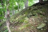 | 続百名城17城目登城。あいにくの小雨交じりの中、かなりの急勾配の舗装された道を登り、きつい道のりだったが、二の丸・本丸と進み、無事スタンプもゲット。本丸では雨も一時やみ、山頂からの眺めを楽しめた。かなり急な土塁は多くみられたが、蒲生氏時代の石垣は見つけることができなかった。 |