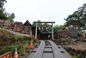 | みょうとうどん加須店にてネギたっぷり肉汁うどんをいただいた後に訪問しました。 レストハウス前に車を停め、くい違い虎口10分ほど歩くと唐沢山神社があり、社務所にスタンプが置かれています。参道は舗装されていて歩きやすかったです。 ずっと小雨でしたので山の下は霧がかかったようでほとんど見えませんでしたが、結構高さがあるので天気の良い日は見晴らしが良さそうです。本丸跡が現在の神社で、周辺にたくさん曲輪や堀切の見どころがあるようでしたが、遠いため断念。神社横に立派な石垣が残っていました。 |