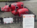 | 東北6県のお城めぐりツアーのスタートです。店主前で「赤べこ」が迎えてくれました。天守出口に売店があり、スタンプは売店の出口に置いてあります。天守出口の外階段を上がり売店出口から入ると無料でスタンプは押せます。本郷焼の赤瓦が印象的でした。 |