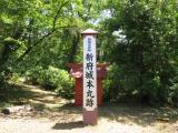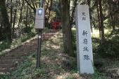 | 続100名城(23城目)。藤村記念館から車で35分程度で韮崎市民俗資料館に着きました。職員の方から「新府城と七理岩」のパンフレットで簡単な説明を受けました。新府城駐車場に向かっていたところ新府城址と刻まれた石碑と藤武神社鳥居がありました。その前に数台の駐車スペースがあったのでそこに停め石段を上り本丸跡へ向かいました。 |