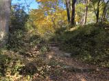 | 登城路はハイキングコースにもなっているので、春・秋なら比較的楽に登れる方だと思います。登城の途中には土塁や、藪のすきまから竪堀を見ることができました。いくつかの門跡も山城としては大きく防御が堅い城だったとわかります。諏訪水へ寄るには少しだけ藪をかき分ける必要がありますが、今でも水を湛えていました。帰りは向い側の尾根にある熊城を探索して日吉神社へと降りました。 |