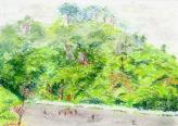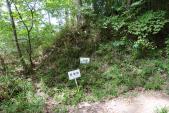 | 武田氏館から車で向かいました。ひたすら上り坂を走り、15分程で要害山下の駐車場に到着。10台ほどのスペースにすでに6台ほど駐車していました。 そこからすぐ城への登り口なのですが、いやはや猛暑の中ということもあり、汗だくだくで登っていきました。地面も少しぬかるんでおり、登山用の靴でないと滑りそうです。途中の井戸跡、何か所もの竪堀や門跡を通って頂上の本丸についたのは40分後でした。この間、人間に一人も会わず。あの駐車していた車の数は何だったのでしょう。 いずれにしても、戦国の人たちはよくもまあこんな厳しいところに築城したものだと、改めて感心しました。 下山しているときに一人の男性とすれ違いました。結局1時間強の間に登城者は2名ということになります。 |