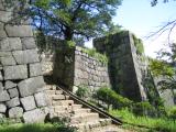 | 雨降りの2008年5月31日に行ってきました.駅のホームから見えるほど近くにあります. 本丸の同心半円形の石垣は見ごたえ十分です.再建の三重櫓も木造のため,急階段やギシギシきしむ感じがいい雰囲気です.三重櫓1階にあるスタンプは良い状態でした. |