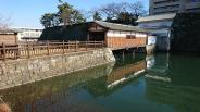 | 【100+70城目】 石川・福井3城攻めの最後。冬の城巡りは夕方が早く損した気分になる。特にビル群に太陽を遮られると、薄暗さがより早めに訪れる。城内に公共施設が建てられるケースが多いが、県庁、県警本部がある福井城はその典型例。立派な石垣、水堀が現代でも外からの進入を容易に許さない。県庁時間外出入口でスタンプを押印させてもらう。百名城巡りの際は工事中だった初々しい山里口御門と御廊下橋を見学。御門の櫓の中でビデオが見られる。その後天守台、水堀の外周を一周し、福井駅から帰路。 |