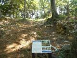 資料館の後ろから獣避けゲートを開けて、つづら折りの長い登山道を登っていきます途中に伝二ノ丸があり、それを少し登った所にあります 北西の曲輪は幾重にもあり、一つ一つの曲輪に高低差があります、ロープを伝わって下りる所もあり守りの堅さを見せつけています 本丸には虎口と石垣が残っています(本丸にとても綺麗に積みあげられた小さな石垣がとても謎です(゚∀゚;)) |