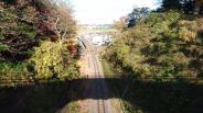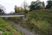 弘道館見学後、工事中の大手門脇の迂回階段を登り、二の丸へ。幼稚園、小学校、中学校、高校があつまった、きれいな白壁塀の通りです。二中見晴台からは那珂川を眺めると、段丘の上にいることが分かります。残存建造物は水戸一高の藥医門のみとのことですが、線路や道路が底を通る堀切はスケールが大きく見事でした。 |
