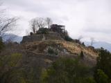 | 下の方の駐車場から山道を抜けるルートで登城。道中から見た天守跡のバックに雪山が見え絶景でした。 |
