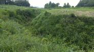 茶畑の中をさ迷いつつ、ビジターセンターに到着。スタンプとパンフレットをゲット。パンフレットを見ると近そうだったので、大雨の中を二の曲輪中馬出(三日月堀)まで歩く。さすがに名物だけあり、スケールの大きさにびっくり。 |