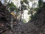 | 上越から戻った翌日、掛川駅でレンタカーを借りて訪れたのは高天神城。まずは大東北公民館でスタンプを押印、パンフをいただいて、いただいた助言のとおり、追手門側に車を止めてさっそく城攻めを開始。 この日、直接二の丸方面へ連なる道は、土砂崩れのため立ち入り禁止だったため、三の丸、御前曲輪、本丸と転戦、さらに井戸曲輪を経て高天神社に至る。ただ、ここまでは武田・徳川による激戦の城という印象が希薄な印象。馬場平では遠く御前崎の風力発電施設や太平洋の煌めきをのんびりと眺めることができた。 ただ、堂の尾曲輪から井楼曲輪に至る曲輪群はこの城が「一城別郭の城」と呼ばれる理由そのままに土塁や空堀が緻密に施されており、のどかな印象も一変。これらを体感したのちに、井戸曲輪から三日月井戸を経て搦手門まで下り、再度井戸曲輪まで戻って車を止めた追手門側駐車場に帰還。このあとさらに川原石を用いた玉石垣が不思議な景観を醸し出している横須賀城にも転戦。 写真は、険しい山の中に設けられた追手門跡と、往時の姿を今に伝える堀切跡。 |