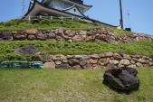| 『続78城目』 名古屋駅へ移動し、JRから名鉄へ乗り換え。岩倉駅で下車し、名鉄バス(約20分、350円、「小牧市役所前」下車)で小牧山城へ向かいます。バス停から歩いてすぐの「れきしるこまき」でまずは押印(印影は良好)。とても立派な土塁を見て、大手口から大手道を登ります。空堀跡を見てから、山頂へ向かい、山頂の石垣をゆっくり楽しみました。快晴なので、頂上からの眺めはとてもよかったです。それにしても時期的な問題なのですが、大量のクマバチがブンブン飛んでいました。いい時間のバスがなかったので、徒歩(15分強)で小牧駅へ移動しました。 個人的には、立派な土塁と岩盤を利用した石垣です。 |