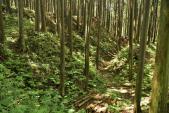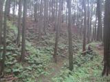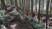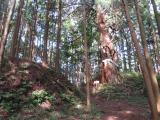| 神社裏の雑木林にしか見えない。 作手歴史民俗資料館でスタンプを押し、城跡までの行き方を尋ねると遠くを指差しあそこの森がそうです、とアバウトな情報。とり合えず近そうなので行ってみる。国道301号を少し戻り信号を左折するといきなり「通行止め」の看板(・・?、が気にせず数百m進むと左手にそれらしき神社が現れる、んっこれか?神社脇の狭い空スペースに車を止め、恐る恐る境内に入ってみる、が案内の類は一切ないのでどう進むかまるで分からん。道かどうかよく分からない所を進むが雨で足元ぐちゃぐちゃだし早々に退散。ご神木のような大ヒノキが目立つのみで、ど素人にはただの雑木林にしか見えんわ(ーー゛)。 追記:2024年9月18日再訪問 歴史民俗資料館で御城印購入。今回はYouTubeで事前勉強。以前は気付かなかったが要所に立て札があって意外に親切、しかも猛暑でもほとんど木陰で楽ちん。ただの雑木林ではなさそう。 |