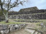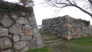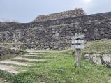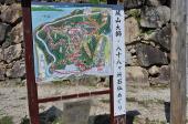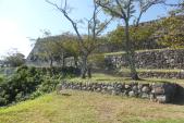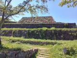 | 麓の駐車場わきの小屋のようなところでスタンプを押しました。 二の丸虎口から登城開始。移築の侍屋敷の長屋門を通り、順路に従って本丸まで登りました。しっかり石垣や郭跡が整備されていて、建物はないものの往時の姿が容易に想像できます。眺望は最高で統治をするのに良い立地です。 |