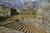| ◆米子城(2/続100城、計88/200城) ・2018年11月23日◇所要時間:3時間10分 ◆左の写真(2018年11月23日撮影): スタンプのデザインが何処なのかが判明していません。写真は背後に大山が望める天守台の西北隅から撮影したものを掲載しましたが、算木積みで組まれた石垣のパターンがスタンプとは一致していないのでここも微妙ですが…。 ◆右の写真(2018年11月23日撮影): 写真は内膳丸を背に、本丸に延びる登り石垣を撮影したものです。奥に見える石垣は遠見櫓跡です。登り石垣は朝鮮半島南岸の倭城に用いられた築城技術で、豊臣秀吉の朝鮮出兵を機に国内にも用いられるようになり、出兵に参加した吉川広家が米子城築城の際に取り入れたとされています。国内では他に竹田城、淡路洲本城、彦根城、伊予松山城でも確認することが出来ますが、米子城の登り石垣ほど、そ全容を間近に見ることが出来る城郭は他にないと思います。城域の遮断線や山上と山麓の一体化感などの魅力が直に伝わって来るのは、本当に素晴らしいと思います。 |
