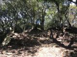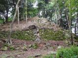 ・館跡・龍福寺、高嶺城址、乗福寺、瑠璃光寺と大急ぎで回りましたが、さすがに大内文化が栄えた地、見所がたくさんありました。・続100名城のスタンプは、館跡近くの「大路ロビー」にありました。 ・高嶺城址は、おとどいやま森林公園駐車場から徒歩45分とありましたが、更に、城域にある電波塔まで狭い林道がついており、終点に数台は駐車できそうでした。かなり狭くて、路肩も危ない道なので、山道に慣れない人は45分歩いた方が良いと思います。 ・本丸は、眺望も素晴らしく、破城跡が解かる石垣、散在する瓦の破片などもあって結構楽しめました。 写真:高嶺城本丸 |