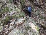 【続48城目】勝瑞城から途中、王王軒でラーメンを食べてから登城(レンタカーで)。 この城はバスで40分かかるうえ日中は2時間の間隔しか来ないので、公共交通機関ではきついと思われる。 スタンプは案内板の横のポスト型のボックスにいれてあり状態はあまり良くない。 雨の日だとスタンプは押しづらい。 本丸まで行きは倉庫跡脇を通るコース。15分ほどで到着。石垣あり。 帰りは蔭滝経由を選択。これが間違いだった。途中で行く先がわからなくなり、岩壁を見ると鎖が。鎖につかまりながら降りていくことがわかった。 まさに登山だ。年寄りや体力に自信がない方は避けたほうがいい。 帰りは30分近くかかった。 写真は同行者の下山状況。 |