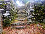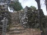 小型バスやマイカーで行き交うお遍路さん。第13番札所大日寺の反対側の登城口に人影はない。 一番の見所は、石段がついた本丸東虎口の石垣。 阿波の青石を用い、そそり立つ急勾配な石垣が 本丸を取り囲んでいる。途中、本丸に至るまでの 才蔵丸、明神丸の切岸や竪堀、小倉丸への堀切は見逃せない。 県内最大級の山城に満足し、一人、異質な登山姿で、参詣する。 |