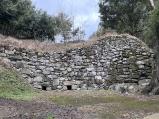 続88城目。日本書紀に記載された日本最古の朝鮮式山城。前年の水城と同じく国土防衛の一環で、665年に築かれた。百済の高官である憶礼福留や四比福夫が築城を指揮。続日本紀には698年に城の修復があったという記載がある。基山とその東峰にかけて、大小の谷を囲み、約3.9kmの土塁・石塁を巡らせている。谷部には石塁を築いて塞ぐ構造で、途中推定を含み4箇所の城門を置いている。また、南側の石塁には排水のための水門を設けている。山頂駐車場から草スキー場の坂を登り、いものがんぎを見てから史跡めぐりのコースに入った。北帝門跡は断念したが、結局礎石群、東北門跡、つつみ跡を経て南下し、水門まで到達。山頂から水門まで約1時間半だった。雪が次第に強まってきたので積雪を懸念し、水門からさらに駆け足で駐車場へ引き返した。 |