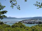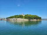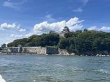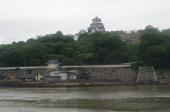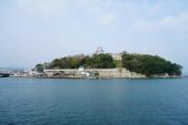 東側の橋を渡ったとここから見ると島全体が城跡なのかがよくわかります。本丸へののぼりがつらい方は本丸までの斜行エレベータ(100円)があるので、それを使うとよいかも。 |