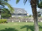 福江にはわずか2時間弱の滞在となり、駆け足での登城。まずは観光歴史資料館へ。時間の関係上、25 分のビデオは断る。 その後、五島氏庭園へ。受付でスタンプ押印後、スタッフの方が丁寧に庭園内を説明。 日本最後のお城。南国風の木々の中にある石垣がアンバランスで面白いです。 |