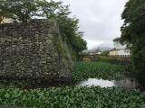 続21城目初登城。昨夜は水城〜吉野ヶ里から長崎に到着、各々自由行動していた仲間達と無事合流。本日は、(やはり)長崎は今日も雨だったが、有志にて8:05のフェリーで福江島へ渡航。190分の航海の後、福江港に到着。滞在時間は2時間強の予定なので、まずは五島観光歴史資料館がそびえる外濠端を目掛けて歩く。表門らしき場所から入城、見所の舟入跡を資料館隣の図書館の一階から観察。資料館で少し五島の勉強をし、学芸員さんから貰った福江城の見取図付資料を片手に文化会館裏の本丸(現在は県立五島高校)内堀、石垣などを足早に確認しながら、本城で最も城らしい佇まいの搦手門へ。ここから進入して五島氏隠殿屋敷庭園受付にて押印する(庭園に入場せずとも押印可能)。クラブ活動帰りらしい五島高生たちが元気に挨拶をしてくれる中、同校正門である裏門から少しだけ本丸を見せて貰う。内堀にかかる眼鏡橋も間近で確認できた。外堀を反時計回りに巡る形で終了。いい城だった。願わくば城関連資料の早期整備を。 |