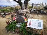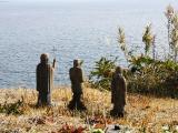 | 179城目 バスツアーで、温泉の駐車場(原城来場者無料)から 、酷暑の中、片道15分かけて本丸跡へ、途中原城総合案 内所でスタンプを頂く。本丸跡で天草四郎時貞の像や スタンプに描かれた3地蔵を発見する。....海側の雑草 の中に |
