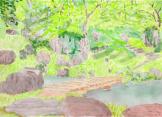 スタンプ置き場のわらべの里(豊後森藩資料館)の庭先にある旧久留島氏庭園の池のほとりでおにぎりの昼食を済ませてから登山開始。一直線のコンクリート坂と階段、その後は登山道で30分ほど登り三の丸到着、本丸までは随所に石塁が積み直されており、見学しながら散策しました。 帰り道に天守代わりと言われた二階建ての茶室は平成12年に保存修理が行われたようですが、残念ながら内部の見学はできませんでした。 |