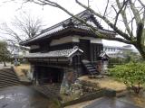 | 延岡発の城巡りの際、レンタカーで訪れました。 最も象徴的な建築物である「三の丸櫓門」は、市民会館(?)の敷地内にあって、門そのもののみを味わうことになります。右手にある鳥居をくぐり、その先の山道を登っていくと、城跡である山頂に着きます。 ハンコは、櫓門の近く(駐車場に隣接する)の歴史資料館に置かれています(入館料を払わなくても押印可能です)。 |