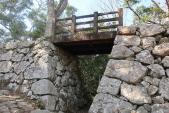 | 176城目。秋のカブ旅行で立ち寄り。 関ヶ原の功績で佐伯を与えられた毛利高政が築いた近世山城で、小高い山の上に本丸と二の丸、その麓に三の丸が位置している。三の丸には天保3(1832)年に再建された非常に立派な櫓門が残っており目を見張る。 三の丸から山上への登城路は3ルートあるが、上りは藩政時代から利用されていた「登城路の道」、下りは「独歩碑の道」を利用した。思いのほか急な山道で大変だったが、15分程で山の上に到着。 要所を石垣の虎口で固めており、中でも本丸へと続く廊下橋周りの雰囲気が良い。本丸の石垣も立派。建物が存在した頃はさぞや壮観な城であったことだろう。 |