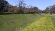 | 堀と土塁に囲まれた本丸が印象的 公園で犬の散歩する方々が多い |