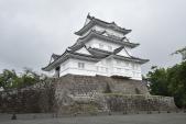 | 初登城。 小田原駅から城に向かう途中、偶然に、謙信や信玄が攻め寄せたらしい幸田門跡を発見。土塁跡を辿り、細い階段から郵便局の裏手に降りて国道1号に出た。 大手門跡の鐘楼を見て、馬出門〜馬屋曲輪〜銅門から二ノ丸に入城し、小田原城歴史見聞館でスタンプ押印。 天守は工事中と知っていたが、足場はもう撤去されており、外観は十分楽しめた。 天守に登れなかったのは少し残念だったが、代わりに城の西方、八幡山古郭東曲輪に登って、城と小田原の街と相模湾を眺める。この日は天気が今一つだったが、いい眺めだ。晴れていたら最高だろう。 |