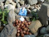 | 52城目。 まっすぐの長くて緩い上り坂になっている参道の突き当りにある。 この参道は武田氏が住んでいた時からあったのだろうか? だとすると城としての役割を兼ねていた割にはずいぶん無防備だが、 神社になってから作ったにしては土地の確保が大変だ。 ともかく自分にとってはこの長い参道も見所の一つ。 姫の井戸のお水は銘水とのことだが、なんだか濁っていて美味しそうじゃない。 しかしちょうど水がなくなったところだったのでもらった。 全部飲んだけど特に体調に異常なし。 水琴窟は全然音が聞こえなかった。 石垣に人形が置いてあってどんぐりがたっぷり供えてあった。 なんだか和む。 |