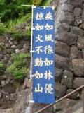 東日本大震災の影響で2011年6月19日で廃止になる「高速道路の休日1000円」の最終日に奈良から関東6城をバイクで一気に攻略する行程1,260km日帰り旅行です。本日の4城目は、武田氏館です。武田氏館は、甲府城から3Kmぐらいのところにあり、百名城ファンは2城セットで訪れているのではないでしょうか。甲府駅からのメインストリートを北に真っ直ぐ2Km、T字の突き当たったところが武田氏館です。正面に鳥居があり、堀には赤い欄干の橋がかかっていてパッと見はお城ではなく神社です。でも、正面の石段の両脇に高い石垣の前にあの有名な甲斐の戦国大名・武田信玄の「風林火山」の「疾如風、徐如林、侵掠如火、不動如山」(疾(と)きこと風の如く、徐(しず)かなること林の如し、侵掠(しんりゃく:おかしかすめる)すること火の如く、動かざること山の如し)の旗指物が立っていて登城者の気分を盛り上げます。石段を登って境内に入るとやっぱり誰がどう見てもそこは神社で、残念ながらあまり見どころはありませんでした。只今、時刻は13時15分、見学はそこそこにして次の小田原城に急ぎます。 |