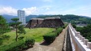 | 89城目 武田氏滅亡後、浅野長政・幸長親子らによって武田氏館に代わる城として築城。天守台は江戸城・名古屋城・会津若山城につぐ巨大なもの。豊臣政権下では徳川氏を押さえる城、江戸時代には江戸侵攻を阻止する城として重視され、幕末まで幕府の直轄領。戊辰戦争では無血開城。 武田氏館と見比べると堅固な事この上ない。野面積みの技術が圧巻。過ごしやすくなった夕方。城内の芝生で家族がボール蹴りしてる。 |