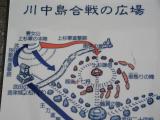 松代城(海津城)は天守・櫓跡はないが、石垣・門・堀がきれいに復元され 管理されていて、見学していてもすがすがしい気分に浸れる城址である。 高い山々に囲まれ、空気もおいしく感じた。 松本インターより長野自動車道に乗り、松代パーキングエリアに寄り道。 川中島合戦第4次の戦いが再現されていた。千曲川、上杉軍の車懸りの陣 武田軍の鶴翼の陣が描かれていました。 |