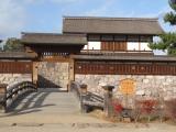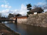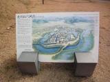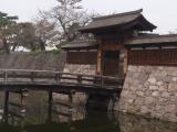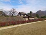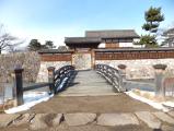 | 中部6城の5城目。駐車場に車を置き、線路を越えて復元された門へ。みやげ点を含め建造物が少なくのどかさが伝わった。濠はあるものの四方が平地で高遠、小諸、上田と回ってきたので、攻撃に耐えられる城だったのかと不安に感じた。 |