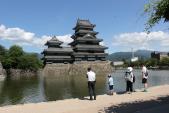 | 松本城は何度登城しても裏切られることはありません。真夏のような陽差しの下、北アルプスを背景にした雄姿は見事です。それにしても、外国人観光客の多さと天守閣内の階段の渋滞には驚きました。なお、スタンプが過半数を超えて51個目になりました。 |