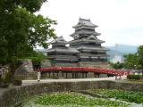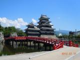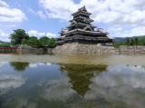 | いつきても大変な人の松本城が、梅雨の合間の時期のためか人出が多くなく助かりました。今までは、いつも城の北側の駐車場に車をとめていましたが、今回、市街地中心側の市営駐車場から歩いたところ、天守閣が信濃の山々を背景に堀越しに見える場所があり、新しい魅力を発見しました。管理事務所でスタンプを捺印。 |