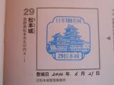 | 大雨の中、登城。生憎の天気にも関わらず、さすがは観光地。結構な人出でした。 蒸し暑い日でしたが、天守最上階に登ると気持ち良い風が通ってさわやかな心地に。古来からの木造建築ってすごいなぁ〜と変なところで感心してしまいました。 スタンプの置き場所が分かりにくいですね。 |