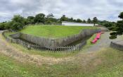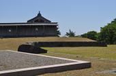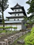 | ◆松前城(99/100城、計134/200城) ・2023年6月28日◇所要時間:1時間25分 ◆左の写真(2023年6月28日撮影): スタンプは津軽海峡を一望するように建てられた天守がデザインされています。この写真は本丸表御門前から天守を撮影したものです。 ◆中央の写真(2023年6月28日撮影): 本丸の南東隅の二重太鼓櫓跡から撮影しました。写真左奥は第五台場跡です。松前城は海防強化の一環として7つの台場を配している中のひとつです。海に向かって土塁を積み上げ、その内側に砲台を構えている様が伝わって来ました。 ◆右の写真(2023年6月28日撮影): 本丸を囲む内堀と天守です。堀幅が狭い印象を持ちました。 |